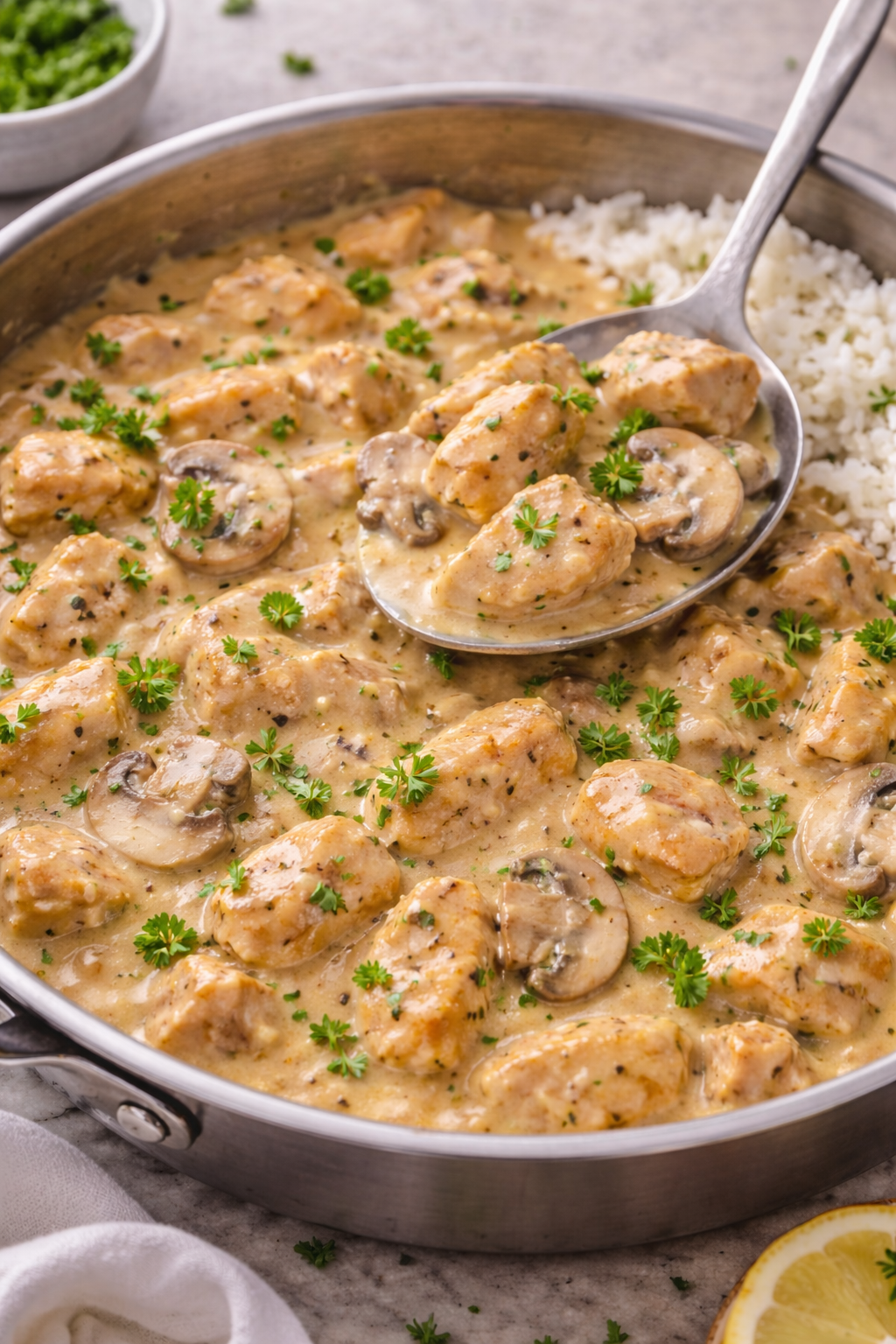 No preparo, o peito de frango limpo e cortado em tiras recebe sal e pimenta antes de dourar no azeite e um pouco de manteiga. A cebola e o alho refogados soltam doçura e perfume, enquanto os cogumelos trazem textura macia. Um pouco de extrato de tomate junto com ketchup e mostarda dão cor e um sabor levemente adocicado; o molho inglês e a páprica equilibram com um toque umami e aroma. Para deixar tudo cremoso usamos creme de leite, e um pouco de caldo de galinha ou água ajusta a consistência. No final, um punhado de cheiro-verde fresco dá cor e leveza ao prato.